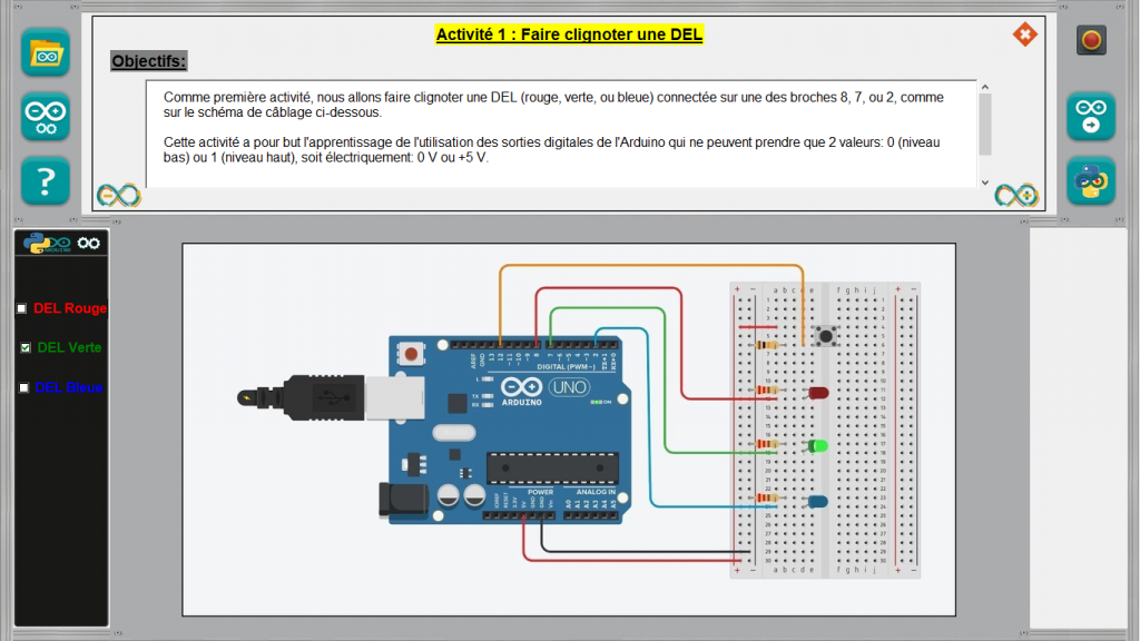 A tout moment, il est possible de visualiser le code et son algorithme, programmé en langage Arduino IDE ou en Python, permettant de réaliser cette activité, en cliquant sur les boutons :