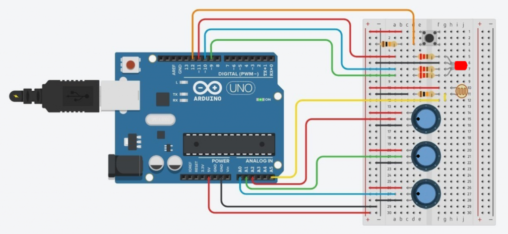 Ici, le capteur utilisé est une photorésistance, dont la résistance varie en fonction de l’intensité lumineuse qu’elle reçoit. La sortie de la photorésistance est branchée sur une des entrées analogiques de la carte Arduino (entrée A5).