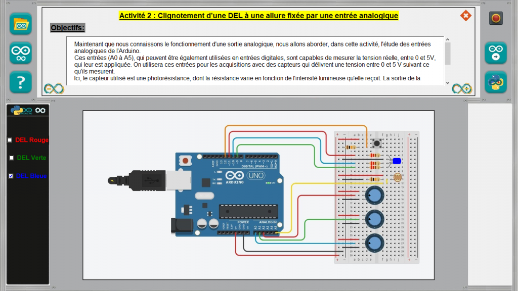 Si le mode de fonctionnement est le ”contrôle de l’Arduino”, la DEL du circuit réel et la DEL sur l’écran clignotent à une fréquence dépendant de l’intensité lumineuse de la photorésistance réelle ou de celle du circuit sur l’écran (le changement d’intensité lumineuse est alors simulé en passant la souris sur la photorésistance).