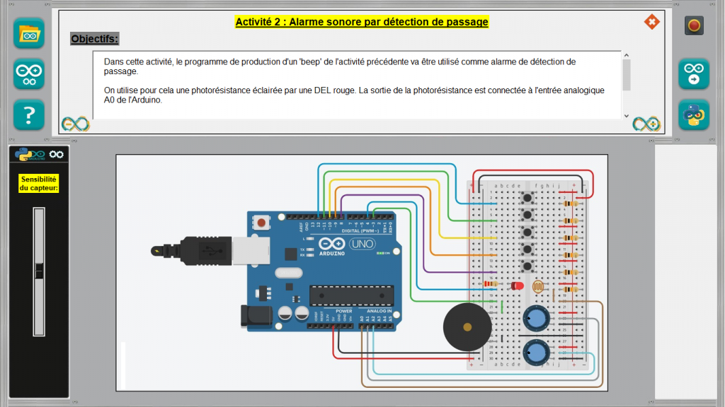 Si le mode de fonctionnement est le ”contrôle de l’Arduino”, en présence d’un obstacle entre la DEL et la photorésistance réelles déclenche l’alarme si la sensibilité de déclenchement a été bien réglée.