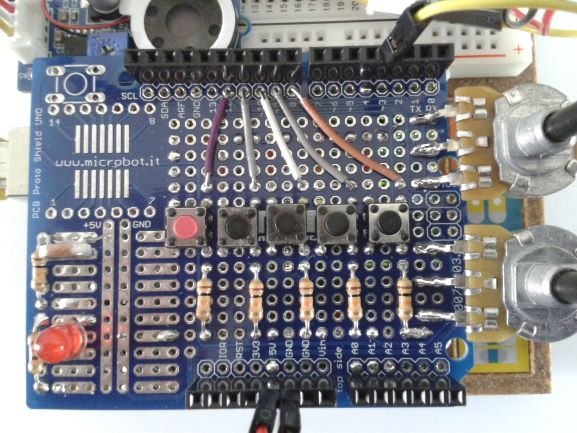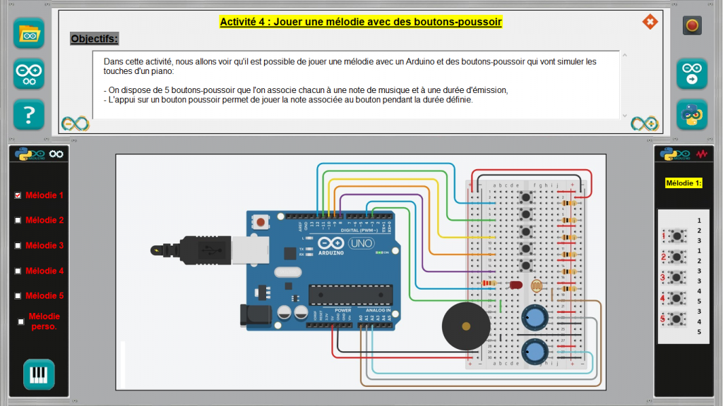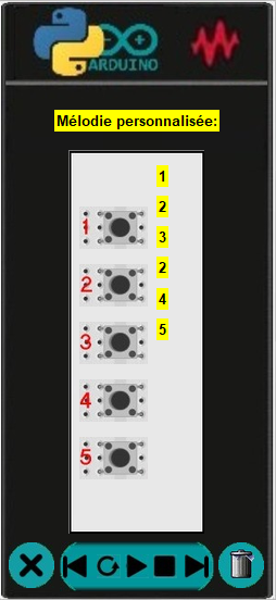Si le mode de fonctionnement est le ”contrôle de l’Arduino”, la mélodie est jouée aussi bien en appuyant sur les boutons poussoir réels que virtuels, en suivant la partition (liste dans l’ordre des boutons à appuyer)