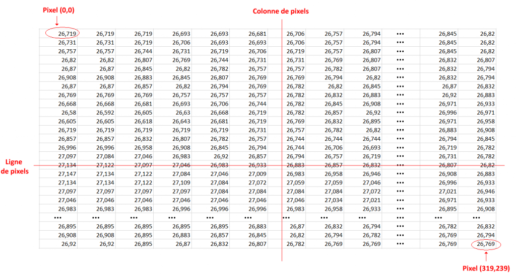 Les fichiers CSV issus de ces caméras thermiques représentent alors un tableau de 320 colonnes et 240 lignes contenant les valeurs de la température de chaque pixel de l’image :