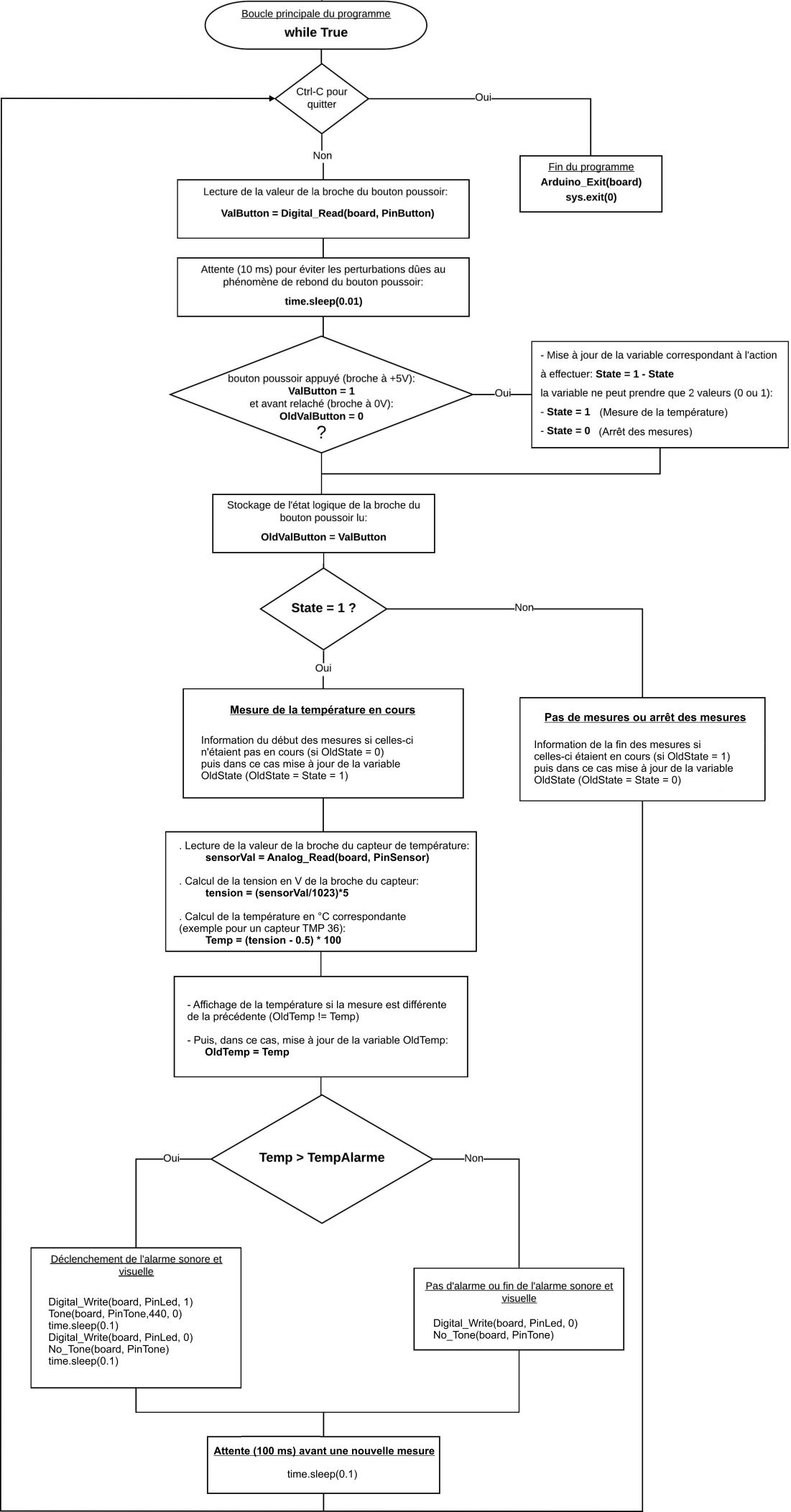 L’objectif de cette activité est de réaliser une alarme sonore et visuelle qui se déclenchera lorsque la température mesurée par un capteur TMP 36 ou LM 35 est supérieure à une valeur seuil à définir, permettant, par exemple, de prévenir un utilisateur du dépassement de la température d’utilisation d’un matériel.
