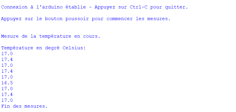 Les mesures de température commencent après un appui sur le bouton poussoir et sont arrêtées en appuyant de nouveau sur celui-ci.