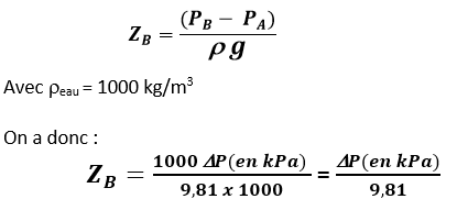 . ZB – ZA = distance entre les plans horizontaux passant par A et B en m.