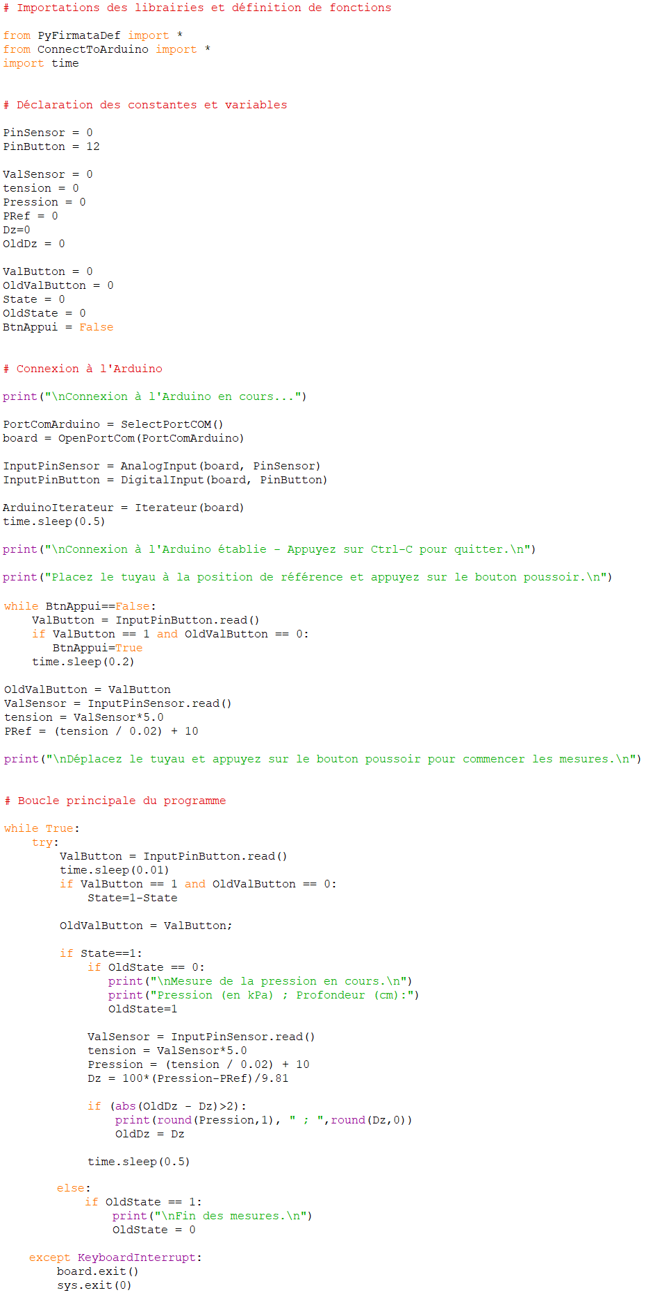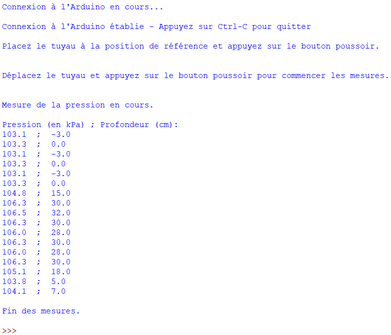 La résolution par défaut du convertisseur analogique/numérique de l’Arduino étant de l’ordre de 5 mV, il est possible de mesurer des différences de pression de 0,25 kPa, soit une différence de profondeur d’immersion (Dz) d’environ 0,025 m (2,5 cm).