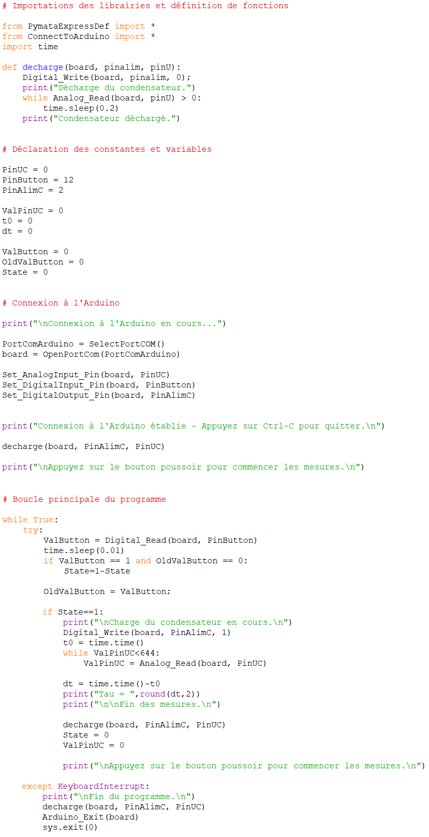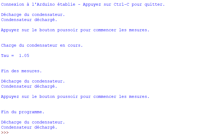 Quand la valeur de l’entrée analogique A0 souhaitée est atteinte, la constante de temps est alors calculée et affichée dans le moniteur série, puis le condensateur est déchargé.