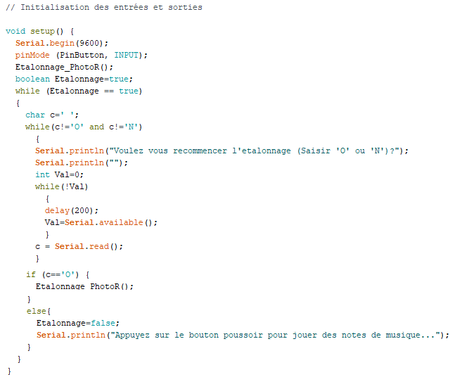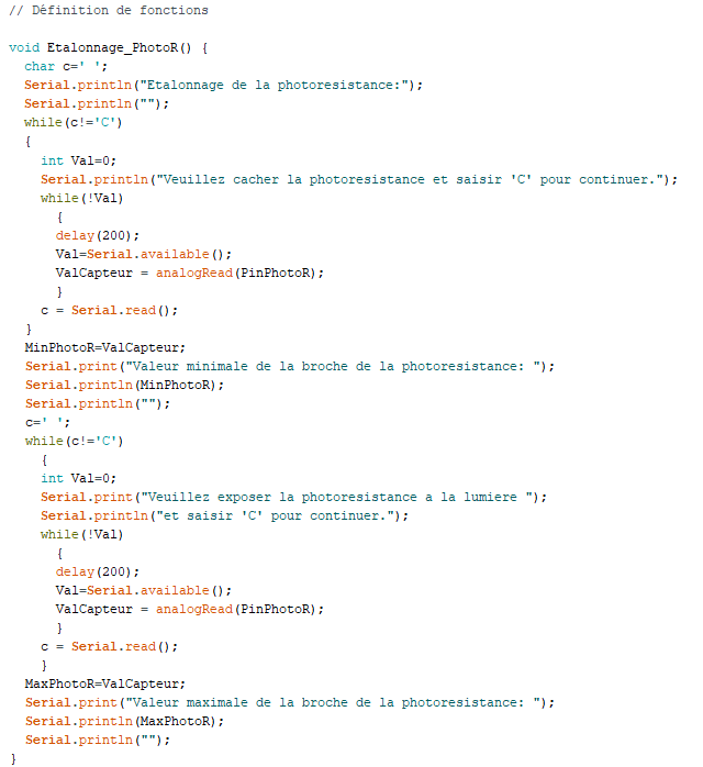 void Etalonnage_PhotoR() (fonction permettant l’étalonnage de la photorésistance):