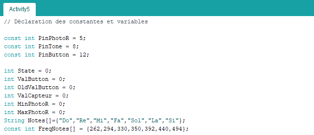 . const int PinPhotoR = 5 (constante nombre entier correspondant au n° de la broche sur laquelle la photorésistance est connectée)