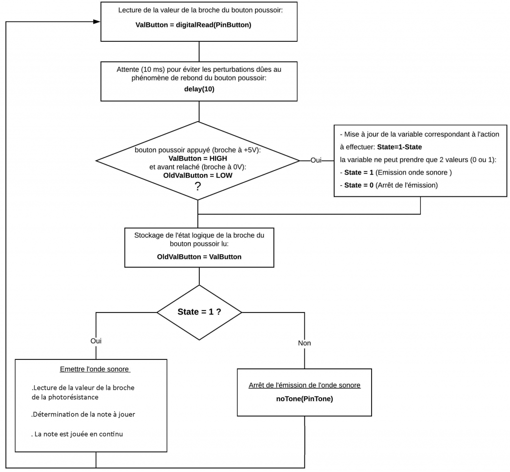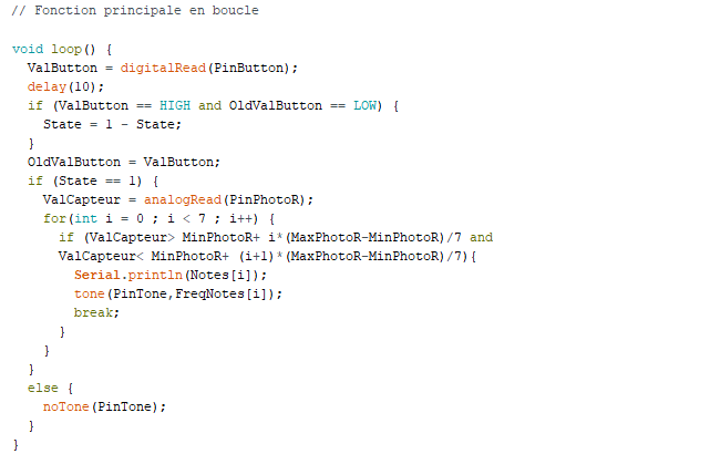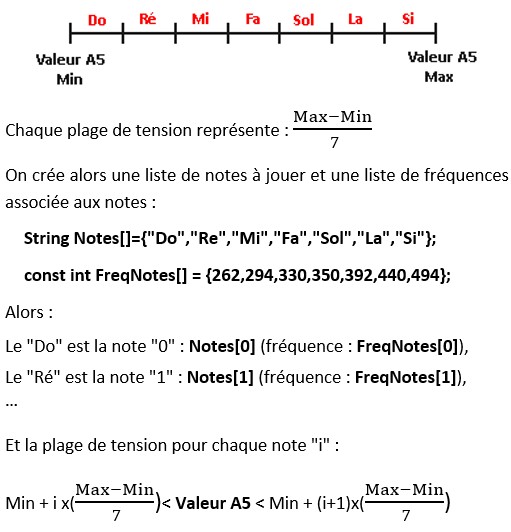 Il suffira ensuite de lire la valeur de la broche A5, de tester dans quelle plage de mesure, elle se trouve et de jouer la note associée.