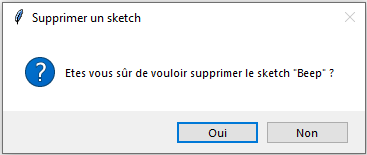 En cliquant sur « oui », le sketch est définitivement supprimé de la base de données d’ArdPylog. Pour supprimer un sketch, il faut qu’il soit au préalable sélectionné en cliquant sur son image dans le panneau des circuits électroniques ou en cliquant sur son nom dans le panneau de la gestion des sketchs.