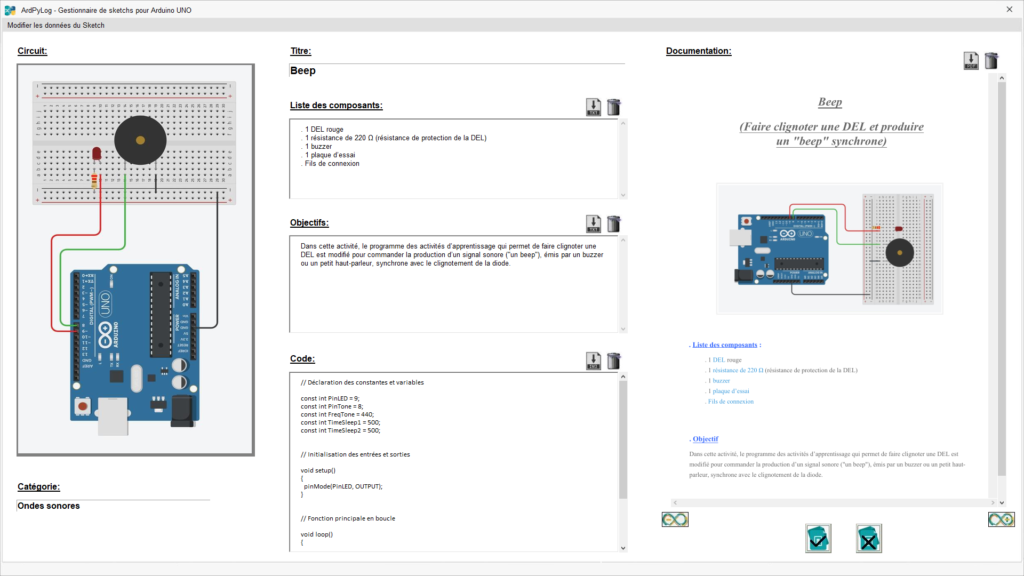 Les zones de texte de la fenêtre de modification des données permettent de définir ou de modifier la liste des composants du circuit électronique associé au sketch, l’objectif et le code du sketch.