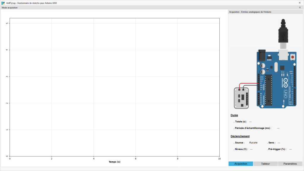 Le mode « Acquisition » d’ArdPylog transforme l’Arduino Uno en centrale d’acquisition grâce à l’utilisation de ses entrées analogiques. Les tensions mesurées sur les entrées analogiques sélectionnées sont acquises pendant la durée et le taux d’échantillonnage définis par l’utilisateur.