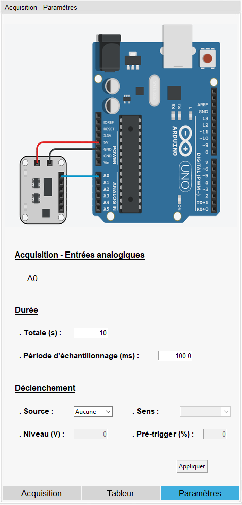 Avant de valider les paramètres, il est indispensable que l’Arduino Uno soit connecté à l’ordinateur, le programme permettant de mesurer les tensions sur les entrées analogiques sélectionnées étant téléversé à ce moment.
