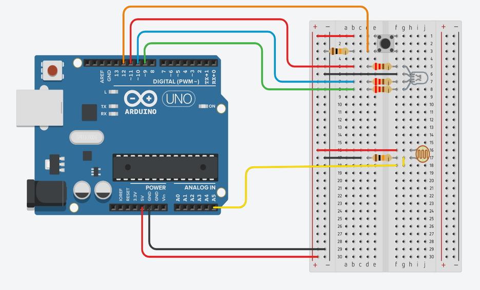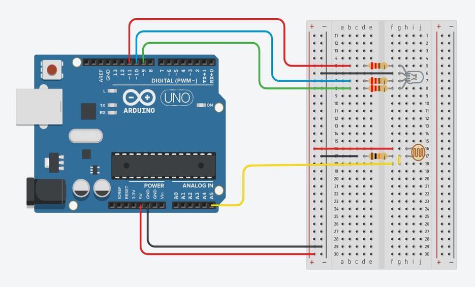 La sortie de la photorésistance est branchée sur une des entrées analogiques de la carte Arduino (entrée A5).