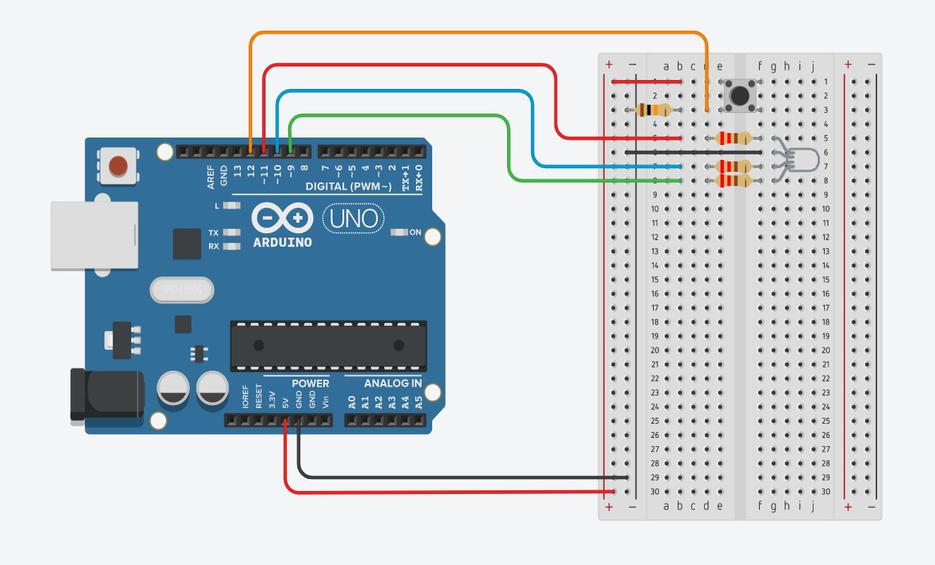 Dans cette activité, l’allumage en alternance des DELs est géré par le bouton poussoir. Un premier appui sur le bouton allume la diode rouge, un deuxième appui allume la diode verte, un troisième appui allume la diode bleue et ainsi de suite…