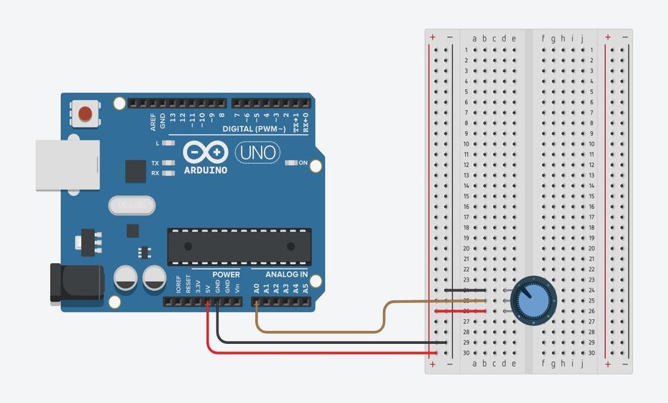 Le circuit d’étude dispose d’un potentiomètre dont le « point milieu » est relié à la broche A0 de l’Arduino.