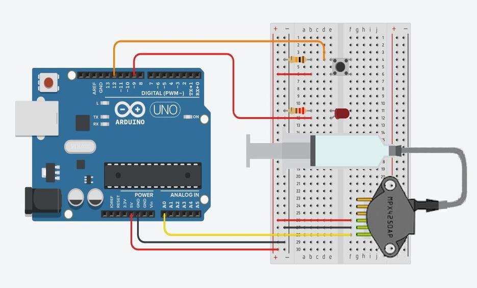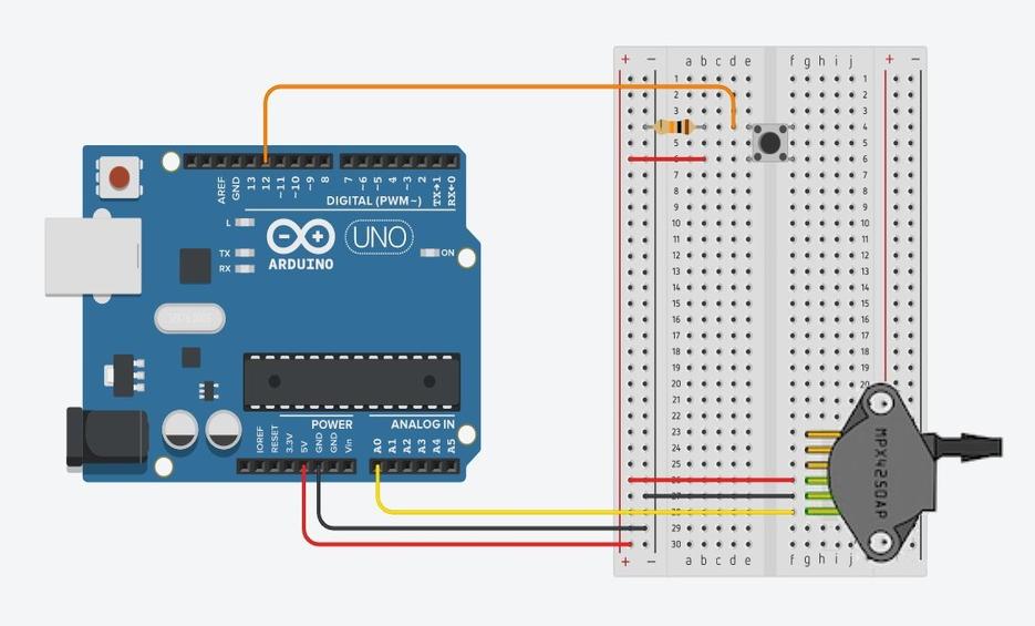 Dans cette activité, nous allons simplement mettre en œuvre l’utilisation d’un capteur de pression dont la sortie est reliée à l’entrée A0 de l’Arduino (Cf. circuit d’étude), pour afficher dans le moniteur série, la tension mesurée et la pression correspondante après un appui sur le bouton poussoir.