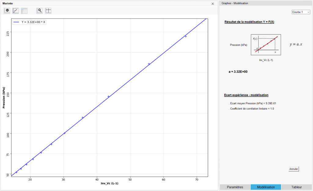 Dans les conditions de l’expérience, la constante de la loi de Boyle-Mariotte est d’environ 3,3 kPa.L