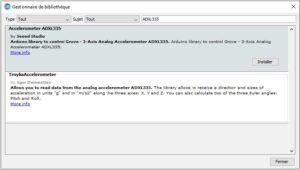 Il suffit ensuite de rechercher et d’ajouter la librairie « Accelerometer ADXL335 » :