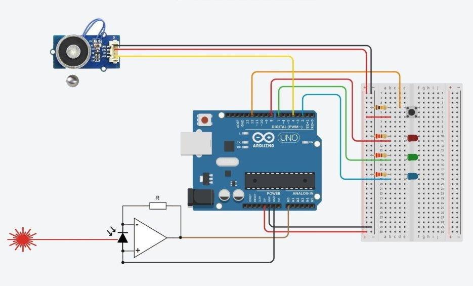Au cours de sa chute, la bille coupe le faisceau laser, provoquant une chute du potentiel mesuré sur la broche analogique A0 de l’Arduino Uno, car la photodiode n’est à ce moment plus éclairée
