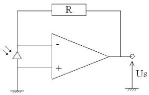 On utilise un montage à amplificateur opérationnel convertisseur courant – tension pour mesurer une tension proportionnelle à l’éclairement de la photodiode :