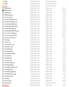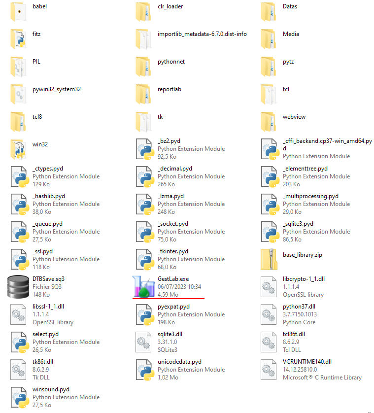 Le dossier principal ”GestLab” du programme contient un dossier nommé ”venv” dans lequel se situe un environnement virtuel de programmation avec les bibliothèques indispensables citées ci-dessus.