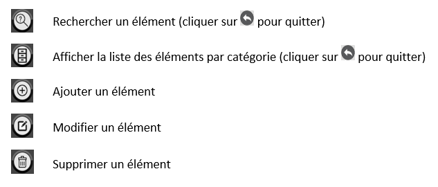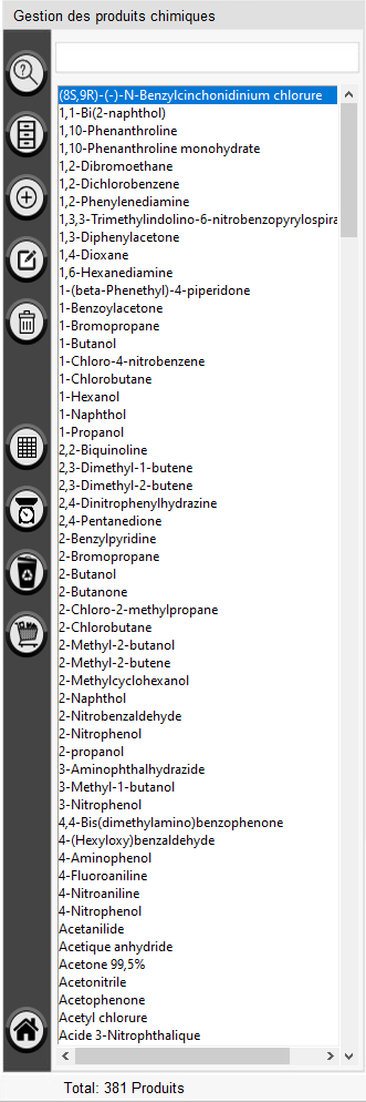 Pour chaque rubrique des sections de chimie et de physique, les 5 premiers boutons de la barre de gestion située côté gauche permettent d’effectuer une recherche des éléments par nom ou par catégorie, d’ajouter, de modifier ou de supprimer un élément de la base de données.