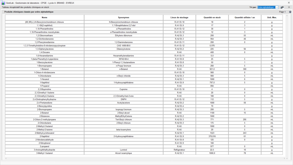 Afficher le tableau récapitulatif des produits chimiques classés par ordre alphabétique, par lieux de stockage, par fonction et par fournisseurs