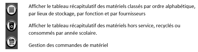 Les boutons spécifiques à la rubrique « Gestion des matériels de chimie et de physique » sont les suivants :