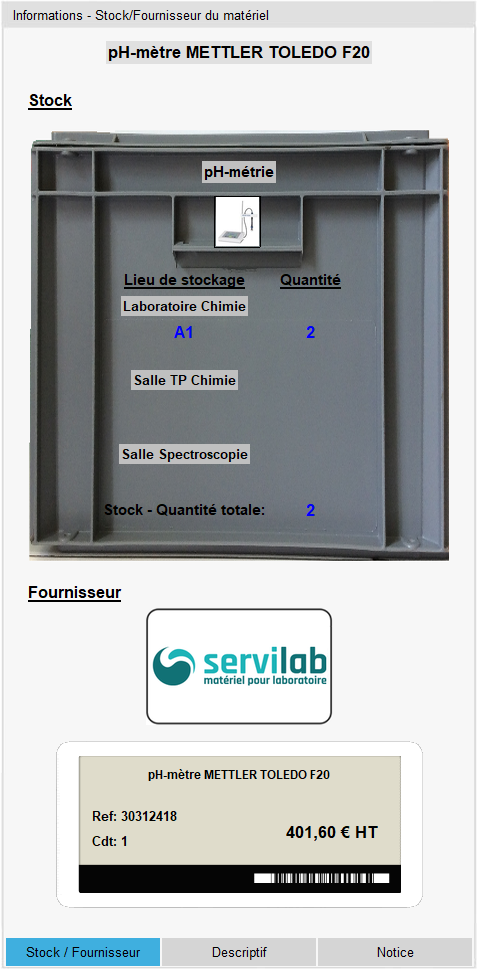 Par défaut, les informations concernant le stock et les références de commande du matériel sélectionné sont affichées.