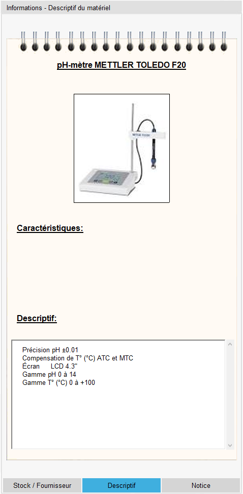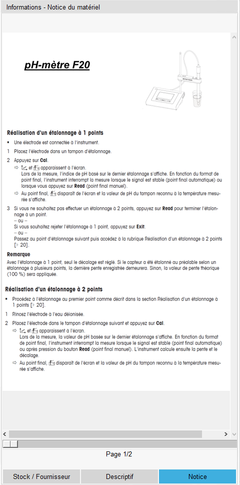 Il est également possible d’afficher le descriptif ou la notice d’utilisation du matériel sélectionné à l’aide des onglets correspondants :