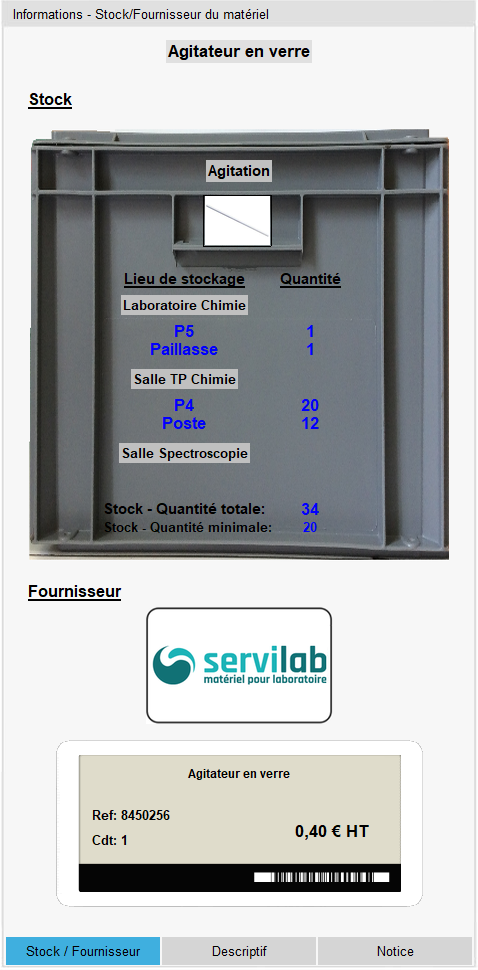 La sélection d’un matériel de chimie se fait par un clic sur son nom dans la liste affichée ou sur une boîte de l’étagère, mais également par la fonction « rechercher » ou la fonction « tri par catégorie ».
