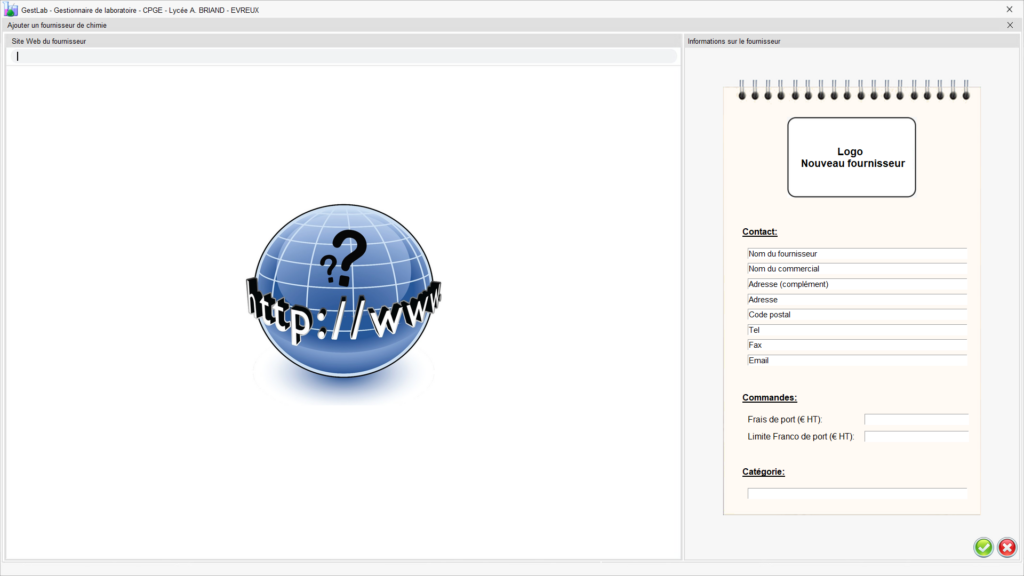 La fenêtre d’ajout ou de modification des fournisseurs de produits chimiques et de matériels de chimie s’affiche en cliquant sur le bouton correspondant (  ou  ) :