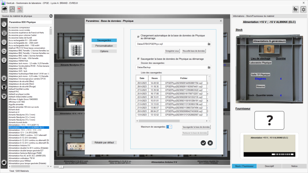 Modification des paramètres de la base de données de physique