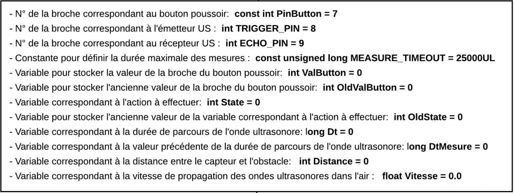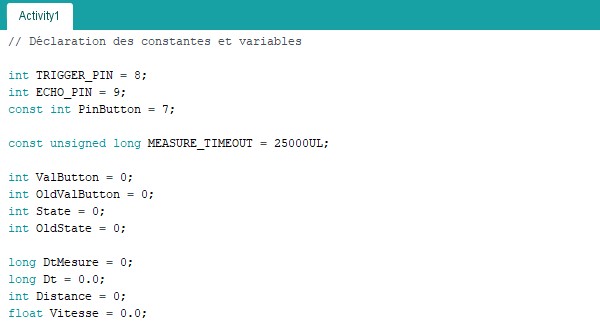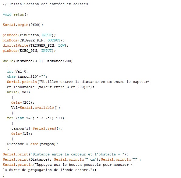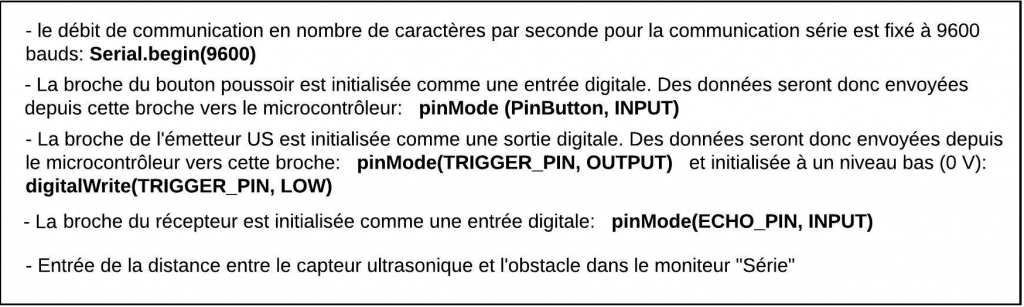 Par exemple, si le paramètre valeur est HAUT, l’instruction pulseIn() attend que la broche passe à HAUT, commence alors le chronométrage, attend que la broche repasse au niveau BAS et stoppe alors le chronométrage. L’instruction renvoie la durée de l’impulsion en microsecondes. L’instruction s’arrête et renvoie 0 si aucune impulsion n’est survenue dans un temps spécifié.