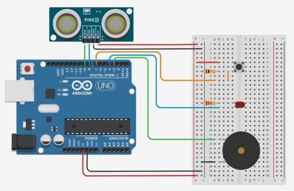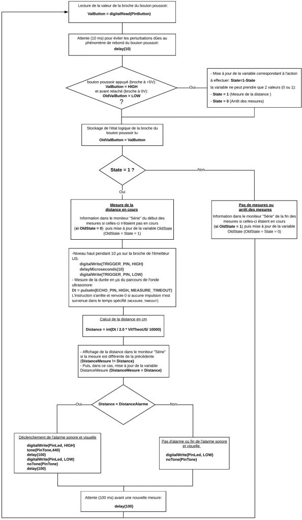 Comme il est possible de mesurer une distance avec un Arduino et un capteur à ultrasons, nous allons dans cette activité, réaliser un détecteur d’obstacle qui déclenchera une alarme lumineuse et sonore, avec la DEL et le buzzer de notre circuit d’étude des ondes ultrasonores, quand le capteur est situé en dessous d’une distance d fixée.