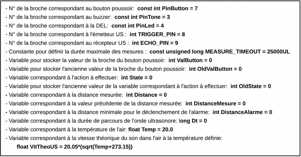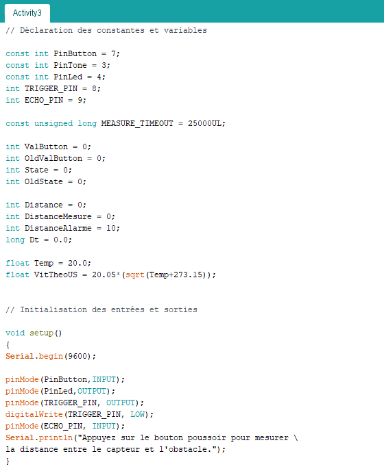 Dans le code de l’activité, la température de l’air est une variable qu’il est possible de modifier. La vitesse théorique du son dans l’air en fonction de la température indiquée est alors calculée et utilisée pour déterminer la distance entre le capteur et l’obstacle.