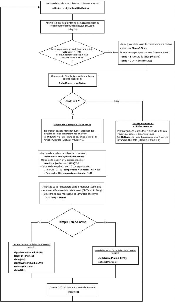 L’objectif de cette activité est de réaliser une alarme sonore et visuelle qui se déclenchera lorsque la température mesurée par le capteur TMP 36 ou LM 35 de notre circuit d’étude est supérieure à une valeur seuil à définir, permettant, par exemple, de prévenir un utilisateur du dépassement de la température d’utilisation d’un matériel.