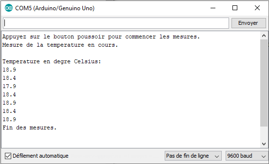 Les mesures de température commencent après un appui sur le bouton poussoir et sont arrêtées en appuyant de nouveau sur celui-ci.